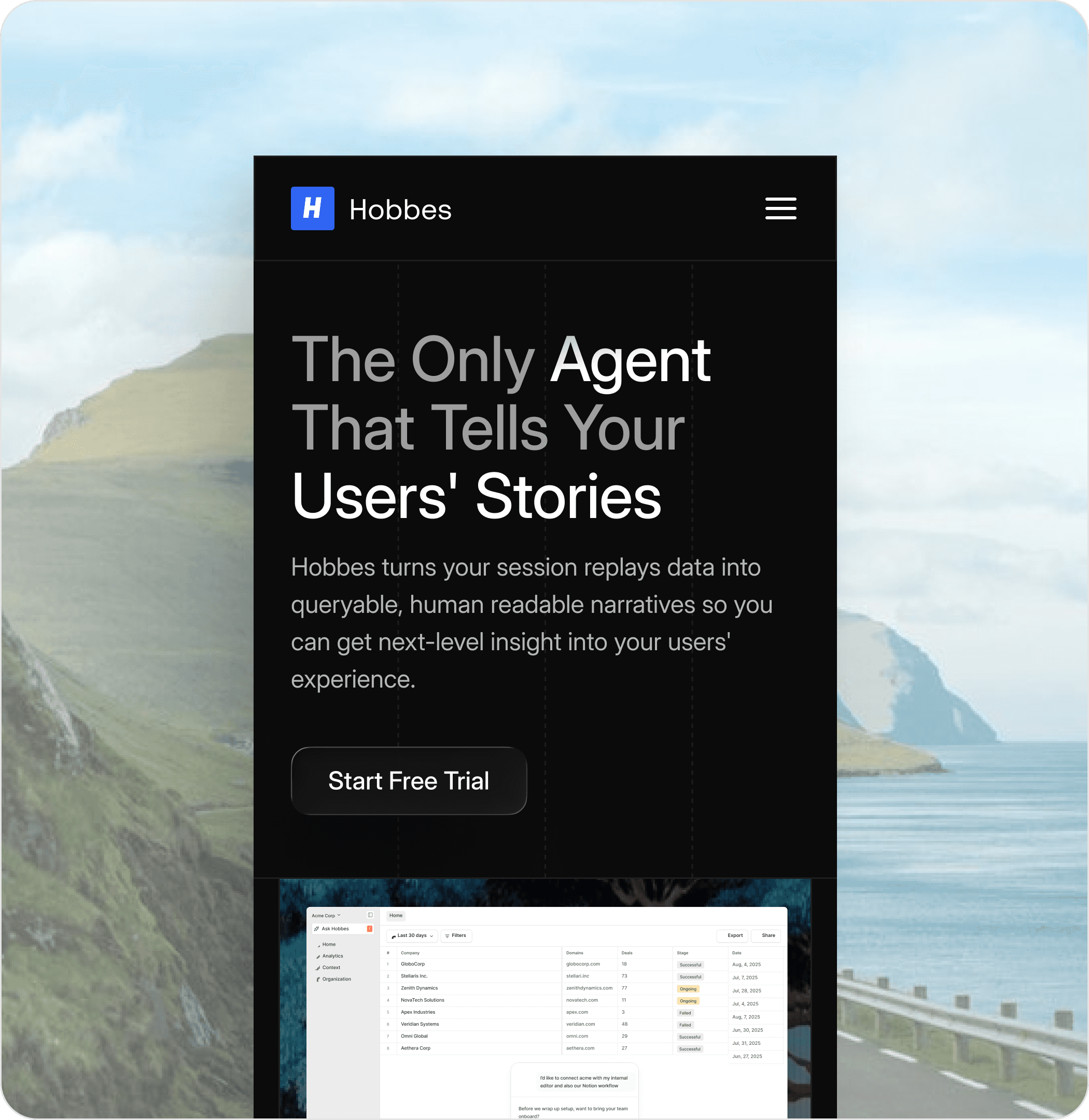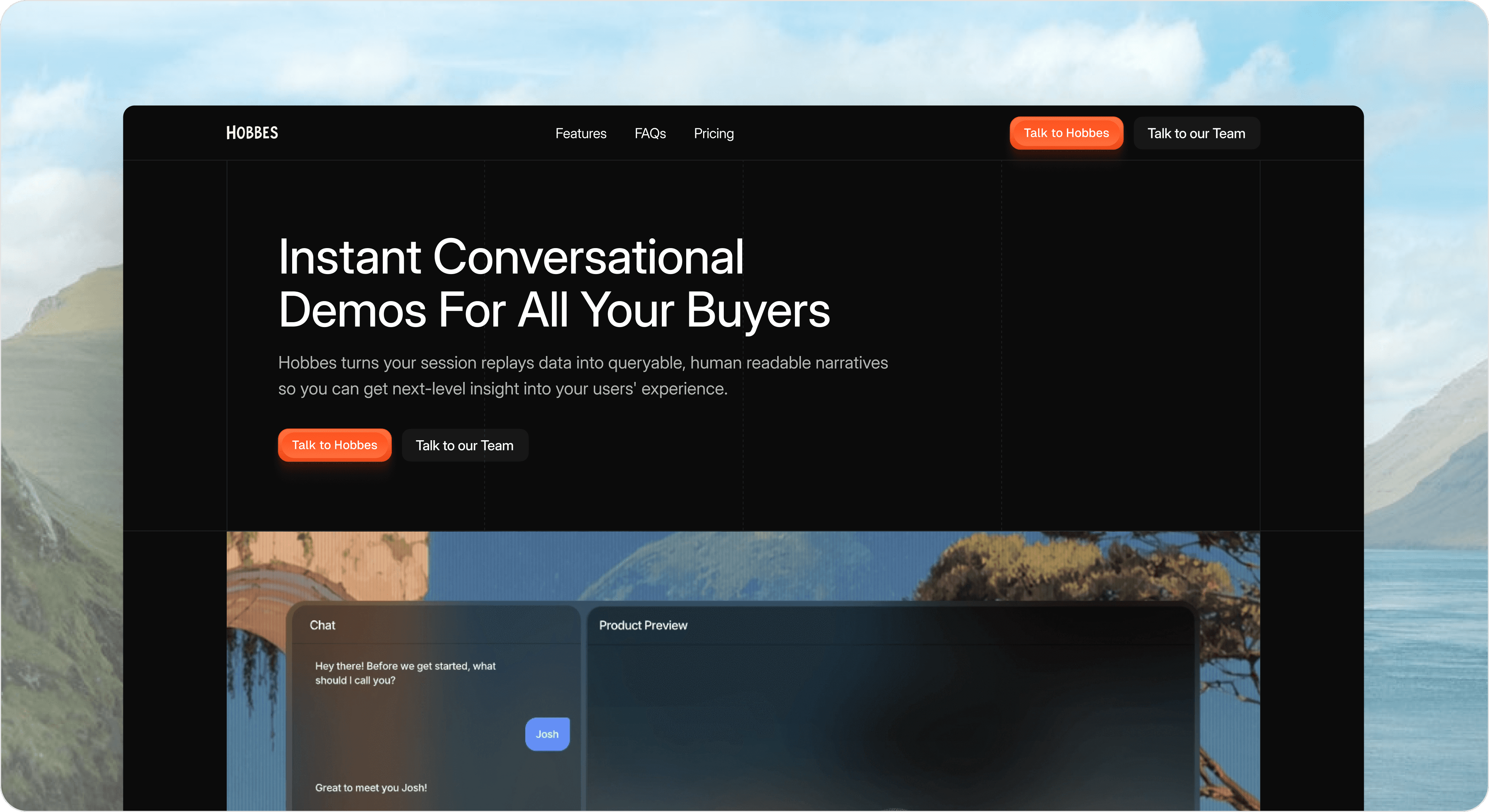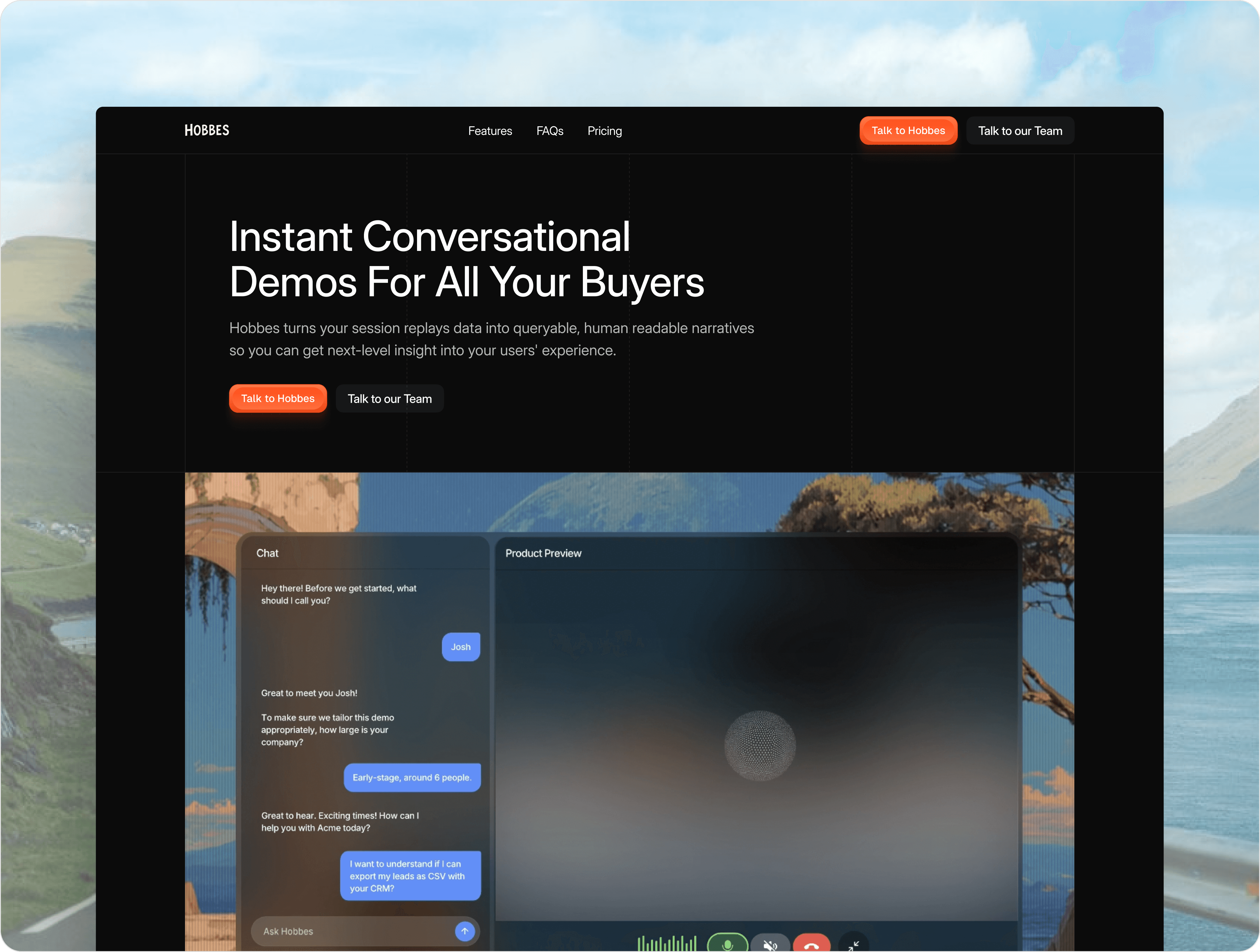 Hobbes is a Silicon Valley–based, seed-funded SaaS platform that runs conversational product demos for every website visitor, 24/7—helping teams qualify users, answer questions, and drive warm leads to sales calendars automatically.